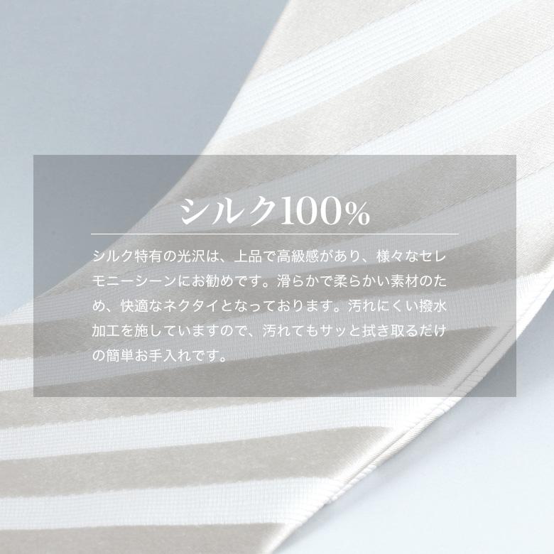 光沢感が美しい、シルク100%フォーマルネクタイです。汚れにくい撥水加工を施しています。汚れてもサッと拭くだけの簡単お手入れ。新品のきれいな状態が長く続きます。ホワイト、ブラック、シャンパンゴールド、ホワイトシルバーよりお選びいただけます。慶事には同系色のポケットチーフと合わせて華やかに。弔事には光沢感のないブラックタイと白無地シャツを合わせて。冠婚葬祭には欠かせないアイテムです。